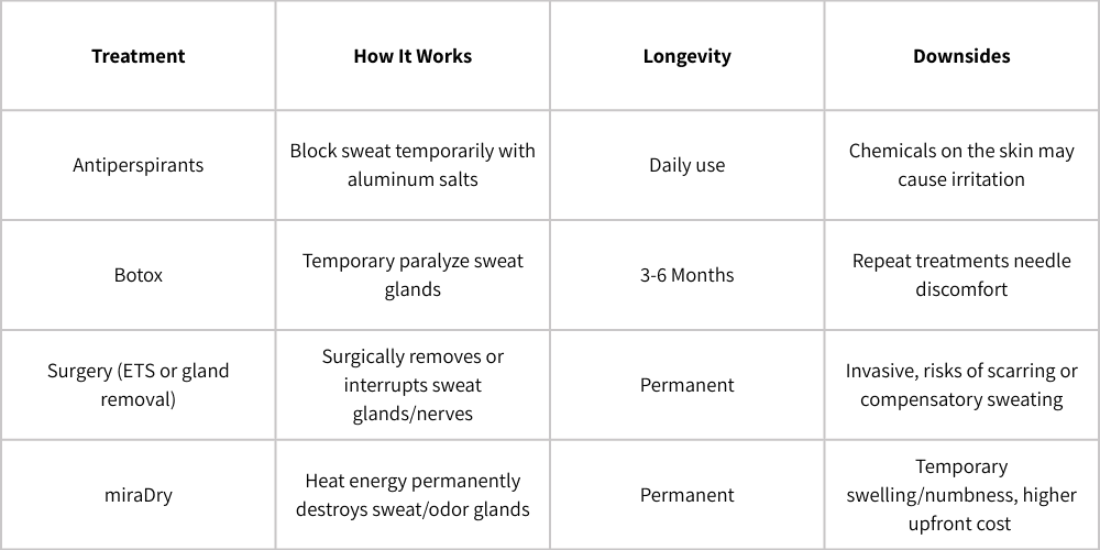 For many patients, miraDry is the most convenient and cost-effective choice because it’s non-surgical, effective after one session, and permanent.