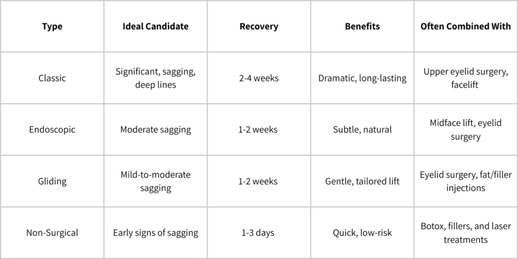 Many patients combine gliding brow lifts with eyelid surgery or fat/filler transfers for enhanced rejuvenation.